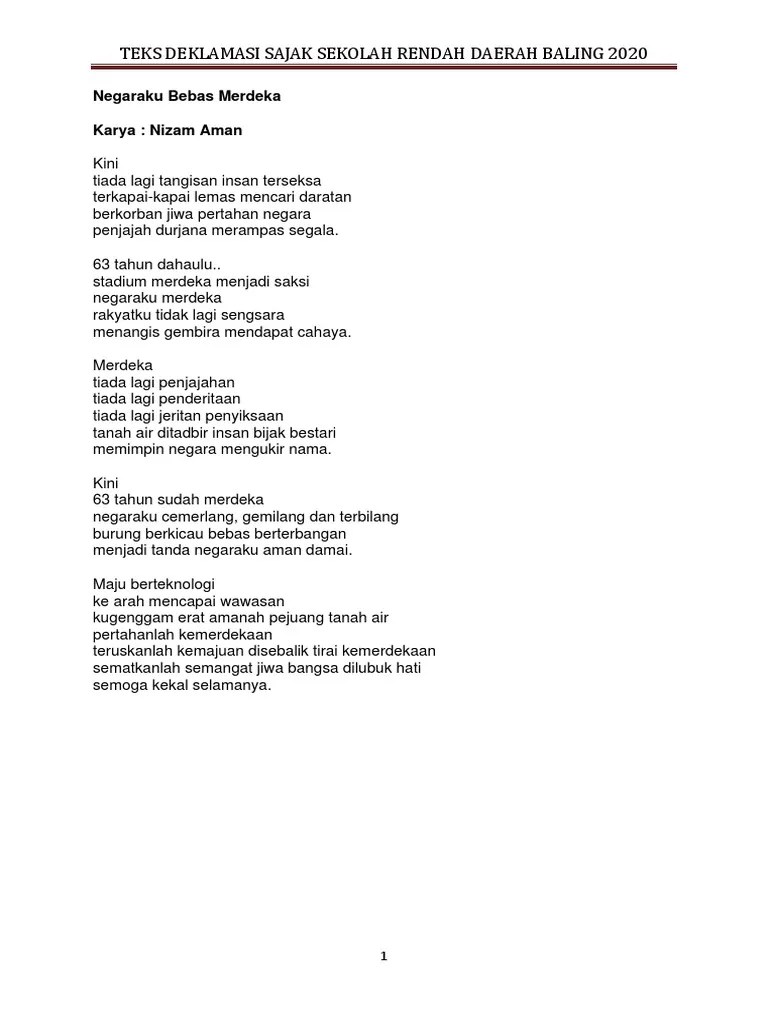 Bergegar dek jerit pekik pejuang kemerdekaan yang mencari benih kebebasan . More from sekolah rendah islam al amin keramat. Untuk bangsa merdeka untuk sebuah bangsa merdeka jauhlah daripada rendah diri. Pertandingan sajak kemerdekaan peringkat sekolah. July 1 at 6:04 pm · 368 views. Pertandingan deklamasi puisi sajak merdeka sekolah rendah tahap 2.